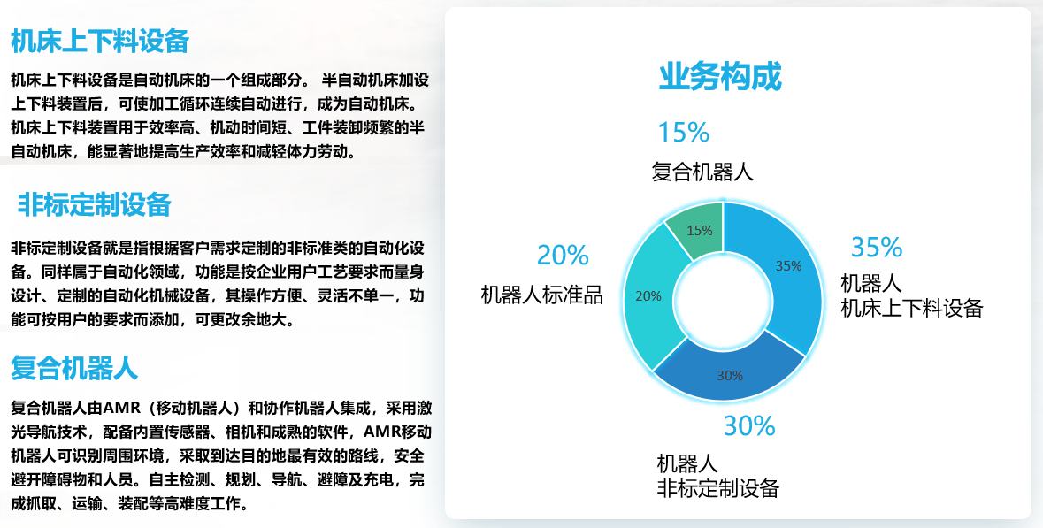 主要针对汽车零配件、汽车电子、消费电子、金属加工、医疗器械以及教育实训等行业,完成机器人设备研发、制造、交付、售后保障等工作;设备应用范围涉及产品上下料、搬运、组装、检测等,积累了行业内大量的成功应用案例。公司拥有优秀的技术团队,有过丰富的国内外企业项目经验;在技术创新、服务与售后方面取得了客户的认可与肯定。